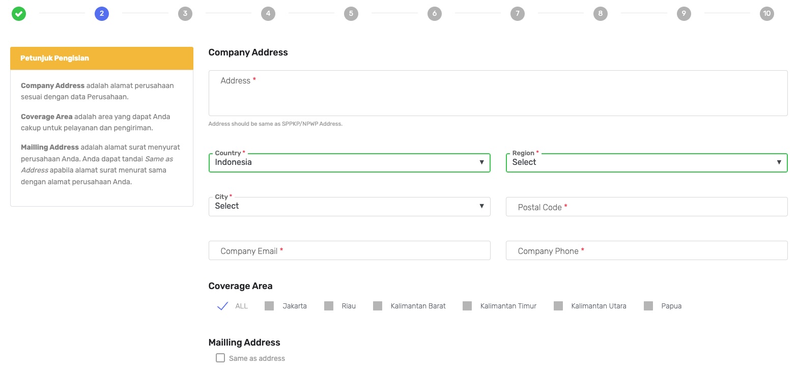 9. Isi Alamat sesuai dengan data Anda, Coverage Area pilih sesuai domisili Anda untuk Perorangan, selain Perorangan pilih sesuai Area yang Anda cover, Mailing Address adalah alamat surat menyurat