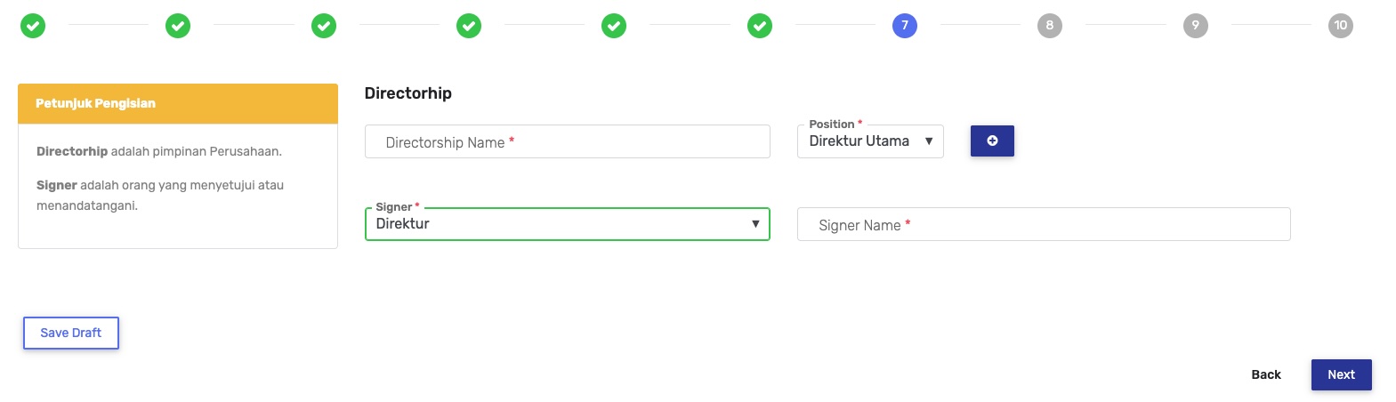 14. Isi Nama Directorship, Signer Name, untuk Perorangan isi sesuai dengan Nama Perorangan