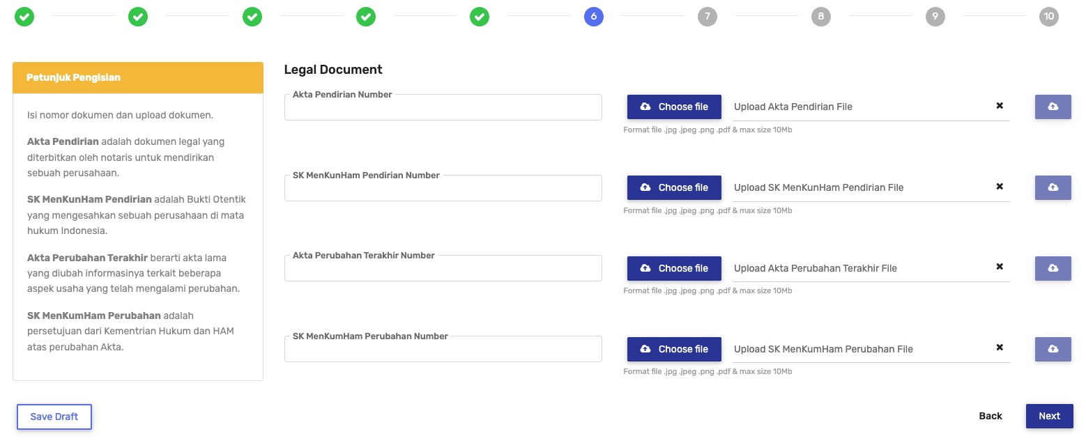13. Isi Legal Document PT/CV/Firma/Koperasi, untuk Perorangan bisa di NEXT tidak perlu diisi untuk melanjutkan ke langkah selanjutnya