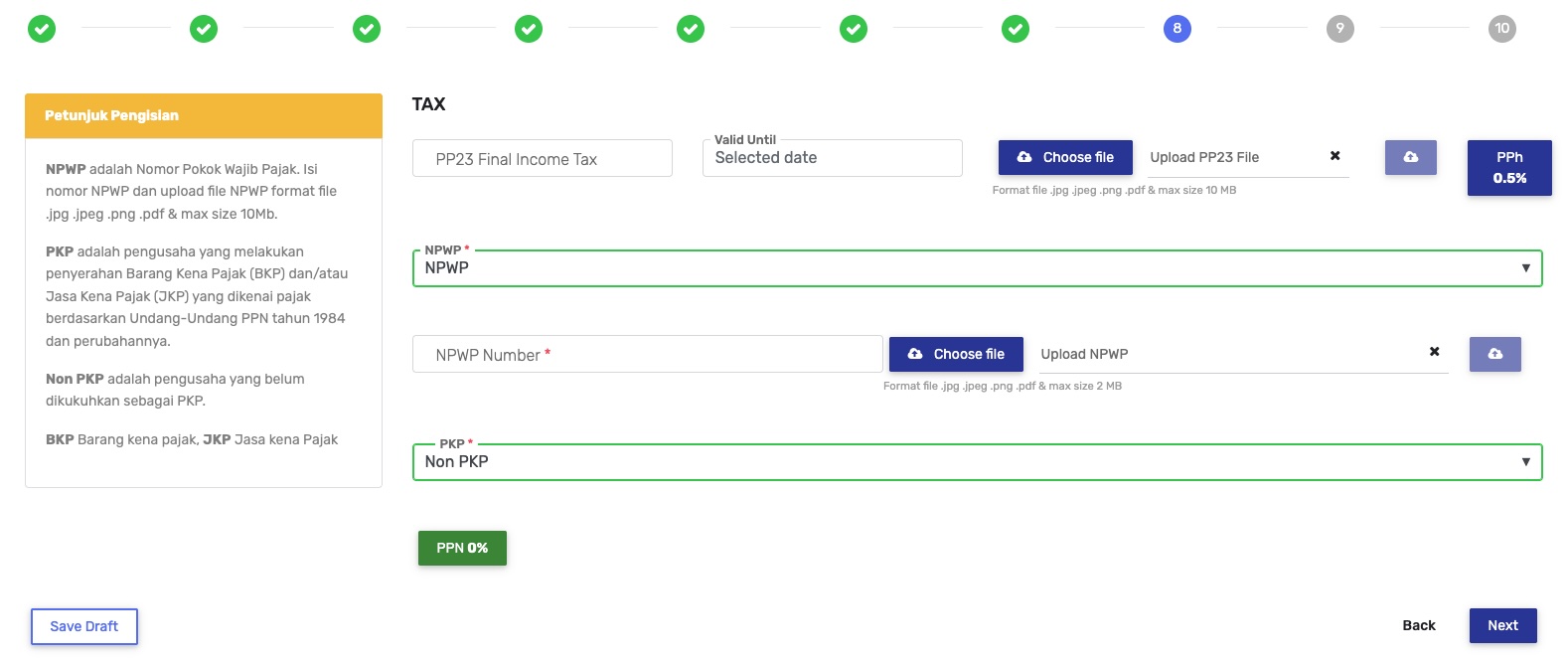 15. Isi Data yang Anda miliki, PT/CV/Firma/Koperasi wajib mengisi NPWP dan SKPKP, untuk Perorangan isi nomor dan upload NPWP apabila tidak PKP isi NON PKP, isi PP23 jika ada