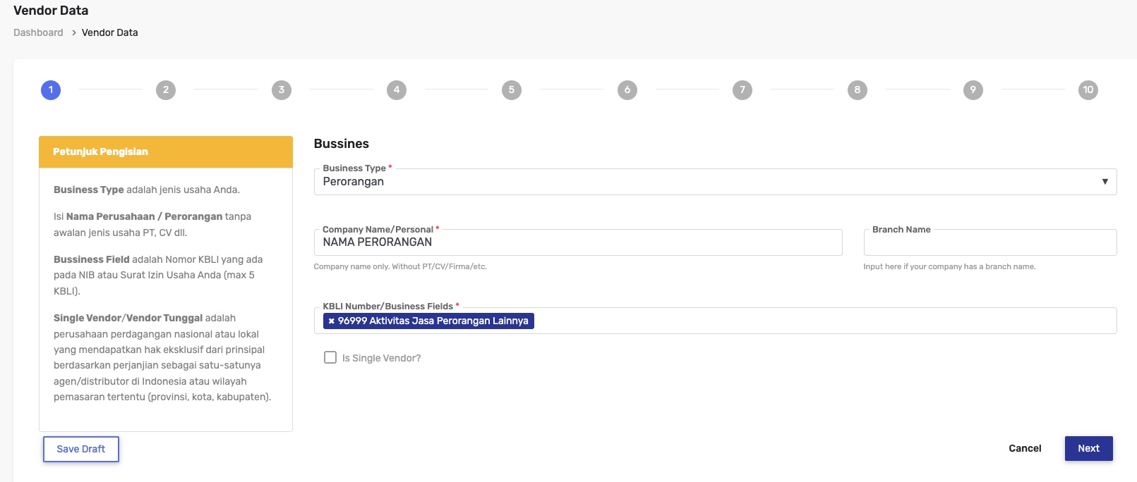 8. Isi tipe Bisnis, PT/CV/Firma/Koperasi/Perorangan, isi Cabang jika ada apabila nama Anda telah digunakan, jika Perusahaan sesuaikan KBLI dengan NIB untuk Perorangan KBLI 96999, jika Anda bukan Distributor Resmi tidak perlu mengisi Single Vendor
