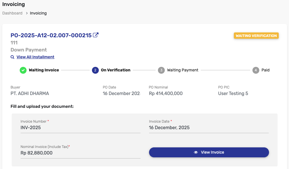 • PO yang terbit dengan tipe pembayaran DP, maka pada invoicing akan ada informasi DOWN PAYMENT